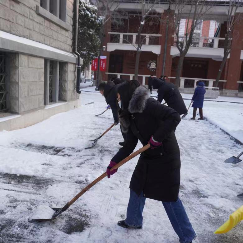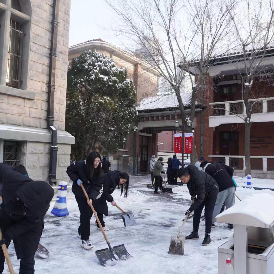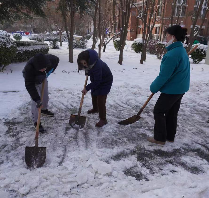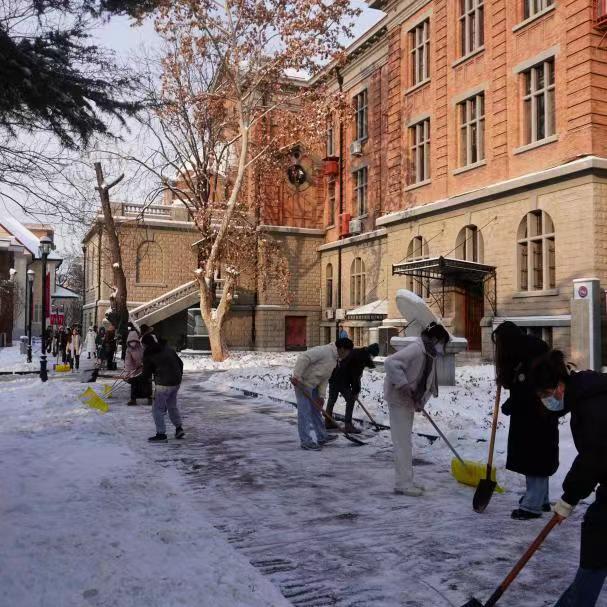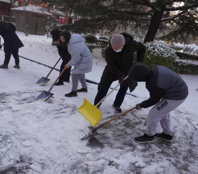 组织志愿者在钟楼外围主干道开展“瑞雪满校园,除雪护安全”师生扫雪除冰行动,齐心协力、挥铲如舞,为全体教职工和学生的交通出行保驾护航。