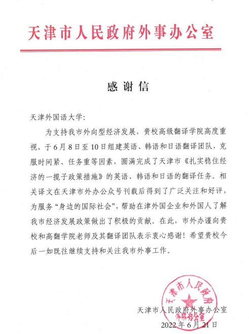 翻译团队圆满完成天津市《扎实稳住经济的一揽子政策措施》重要翻译任务的感谢。